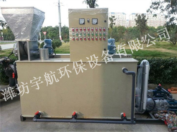 本設備可滿足固體和液體絮凝劑的自動制備,主要由:三腔藥箱,自動吸料機、自動投粉機、自動配水系統、出藥系統,就地電氣控制系統等組成。